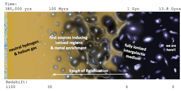 Evolution of the Universe and the Epoch of Reionization. This figure schematically represents the evolution of our Universe. For many years we have been exploring with our telescopes the so-called epoch of reionization during which the intergalactic medium (i.e. the medium that lies between galaxies) passed from a totally neutral state to an ionized one. This period goes from about 100 million years up to 1 billion years after the big bang and is fundamental because the first stars contained in the first galaxies and the first black holes were formed right during this epoch.